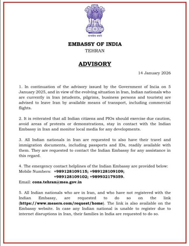 नई दिल्ली : भारत ने ईरान में जारी विरोध प्रदर्शनों और सरकार की कार्रवाई में मरने वाले लोगों की बढती संख्या के बीच बुधवार को ईरान में मौजूद अपने नागरिकों को जल्द से जल्द देश छोड़ने की सलाह दी है और तेहरान स्थित दूतावास में संपर्क करने के लिए हेल्पलाइन नम्बर जारी किये हैं। सरकार ने यह कदम क्षेत्रीय तनाव के बढने और व्यापक प्रदर्शनों के बीच तेजी से बदलती सुरक्षा स्थिति का हवाला देते हुए उठाया है। तेहरान स्थित भारतीय दूतावास द्वारा बुधवार को जारी परामर्श में छात्रों, तीर्थयात्रियों, व्यवसायियों और पर्यटकों सहित सभी भारतीय नागरिकों से वाणिज्यिक उड़ानों सहित उपलब्ध किसी भी परिवहन माध्यम से ईरान छोड़ने का आग्रह किया गया है।यह परामर्श पांच जनवरी को जारी पूर्व चेतावनी के बाद जारी किया गया है। दूतावास ने एक बयान में कहा, “ईरान में बदलती स्थिति को देखते हुए, वहां रह रहे भारतीय नागरिकों को उपलब्ध परिवहन साधनों के माध्यम से ईरान छोड़ने की सलाह दी जाती है।” विदेश मंत्रालय ने भी ईरान की यात्रा से बचने के परामर्श को दोहराते हुए भारतीय नागरिकों को “अगले आदेश तक” ईरान न जाने की सलाह दी है। दूतावास ने सभी भारतीय नागरिकों और भारत मूल के लोगों से सतर्कता बरतने और विरोध प्रदर्शनों से दूर रहने तथा भारतीय दूतावास के संपर्क में बने रहने को कहा है। उनसे कहा गया है कि वे यात्रा के दौरान अपने सभी दस्तावेज तैयार रखें और इस बारे में वह दूतावास से भी मदद ले सकते हैं। दूतावास ने आपात स्थिति के लिए हेल्पलाइन नम्बर भी जारी किये हैं। लोग दूतावास से मोबाइल नम्बर 989128109115, 989128109109,989128109102 और 989932179359 पर संपर्क कर सकते हैं। भारतीय दूतावास से ई मेल cons.tehran@mea.gov.in पर भी संपर्क कर सकते हैं। दूतावास ने सभी नागरिकों को बिना देरी के दूतावास में पंजीकरण कराने की सलाह दी है। यह घटनाक्रम ऐसे समय हुआ है जब अमेरिकी राष्ट्रपति डोनाल्ड ट्रंप ने कहा है कि वह “कड़ी कार्रवाई” कर सकते हैं। रिपोर्टों के अनुसार ईरान में सरकार के खिलाफ जारी प्रदर्शनों के दौरान 2,500 से अधिक लोगों की मौत हो चुकी है। परामर्श ऐसे समय में जारी किया गया है जब ईरान में आंतरिक अशांति बढ रही है। मानवाधिकार संगठनों और मीडिया रिपोर्टों के अनुसार, प्रदर्शनकारियों के खिलाफ सरकारी कार्रवाई में मरने वालों की संख्या हाल के हफ्तों में तेजी से बढ़ी है, जिससे सुरक्षा और स्थिरता को लेकर चिंताएं गहराई हैं। भारतीय अधिकारियों ने कहा कि वे स्थिति पर करीबी नजर बनाए हुए हैं।